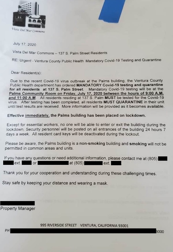 According to local sources, the letter was distributed to building residents in parallel with the County of Ventura declaring the building to be under a quarantine lockdown. According to local sources, this notice from the Ventura County Public Health agency was received on Friday, July 17th, at 6pm, and it described an enforced “mandatory quarantine” for the entire building. (It appears the enforcement order came from the County of Ventura.)