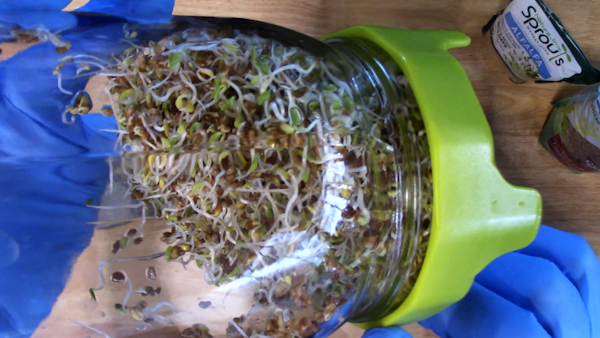 Here’s a screen shot of some of the alfalfa sprouts I grew using this simple method. These sprouts are just 3-4 days old and ready to eat. Just add some salad dressing and enjoy!